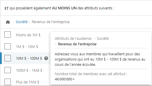 Pour la même raison, vous verrez parfois des attributs qui ne sont pas dans votre scope de ciblage. Par exemple, un léger pourcentage de membre situé dans des entreprises plus grandes que celles que vous ciblez, ou dans une autre industrie). Cela arrive car les membres ont parfois 2 emplois répertoriés sur leurs profils.